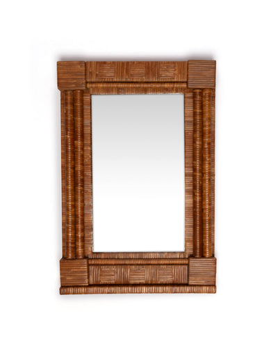 An elegant handmade mirror featuring rattan columns, this piece would look beautiful in the every room at home, from the entryway to the bedroom, bathroom or dressing room.