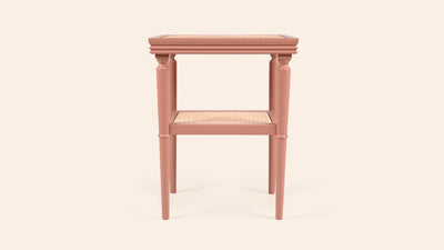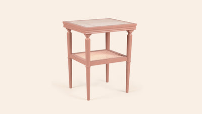 One of their most versatile pieces, Ilaria is a lacquered beech table featuring a natural woven cane top and lower shelf, protected by a glass panel.