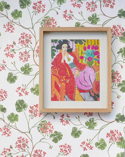 Bring the colour and joy of the outside in, with hand-painted geraniums rambling across your walls. This wallpaper creates a warm and characterful backdrop for any interior.
