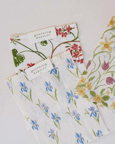A simple blue floral print is a forever classic yet hand-painted Irises make this linen feel unique. The Iris flower takes its name from a Greek messenger goddess and the plant is said to represent hope and faith. Sophie's Iris print came to life in lockdown while reading 'The Language of Flowers'.