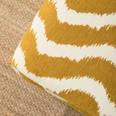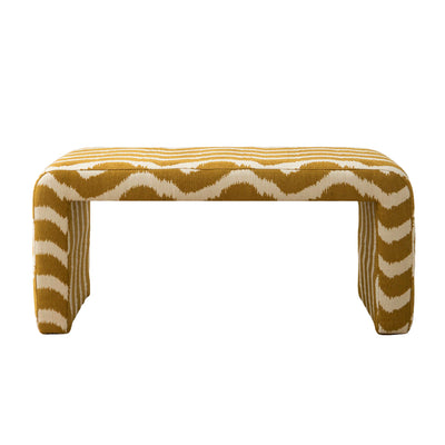 Bench upholstered with a geometric pattern, available to be upholstered in various fabrics.