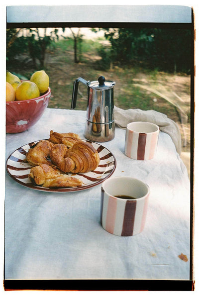 A handmade ceramic cup, in bold stripes of rich brown & blush pink, the bold colour-way inspired by the classic ice cream trio.