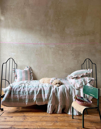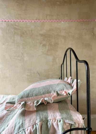 This beautifully soft laundered linen features wide stripes in scrumptious green and pink. The cushion is made entirely from this soft fabric with a generous ruffle around all four edges.
