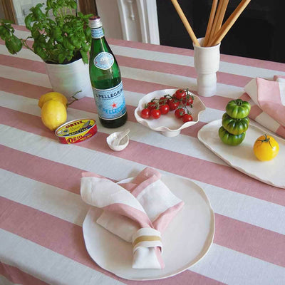 Turn any meal into a joyful gathering with these carefully crafted tablecloths. Designed in Evie & Skye's West London Studio, these stylish hand-painted striped linens go beyond being mere table coverings they're an open invitation to savor moments beyond the dining experience. The bold stripes and playful ruffled border provide a unique touch, allowing your customers to choose between a bold, maximalist look or an elegantly tailored feel.