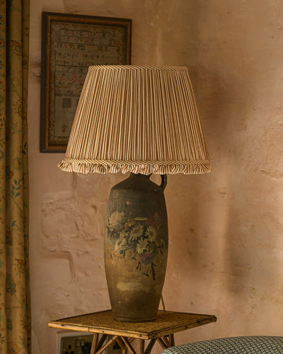 A frilled lampshade woven from a cotton and linen blend featuring a smart pinstripe in a warming shade of Ochre – a colour that’s deeper than apricot, more knocked back than tangerine and earthier than gold.Being lined in white organic cotton adds a pleasing weight and means the light diffuses through the layers of fabric in a cosy, golden way.The table lamp design can also be used as a wall light, and it also comes as a pendant light shade for ceiling fixtures.