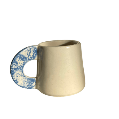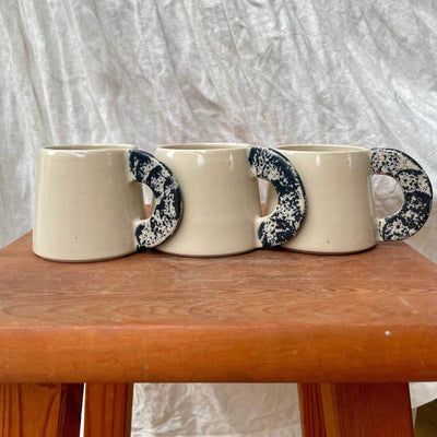 Little espresso cups for espressos and much more. Thrown on the wheel with white stoneware and finished with a slip-decorated slab handle.