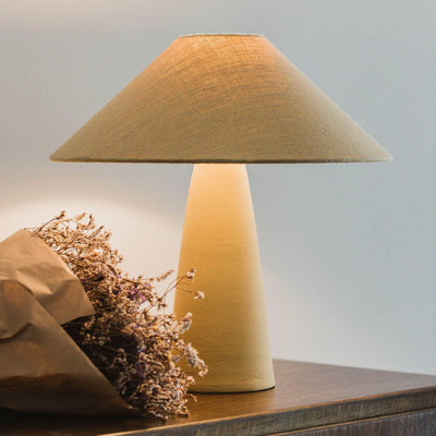 Handcrafted clay table lamp with a linen effect lampshade. White textile electric cord, white hand switch, and white supports. E27 bulb not included.