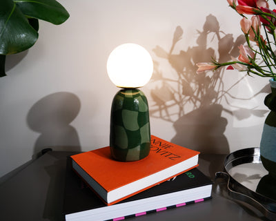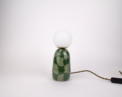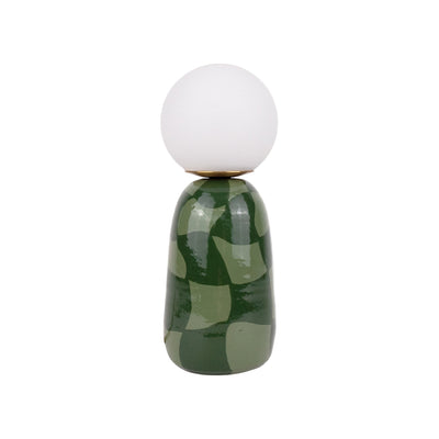 Playful yet modern, this handcrafted ceramic lamp pairs a two-tone green checkered base with a frosted globe bulb for a cozy glow. Its glossy finish and organic design make it the perfect little statement piece for any room.