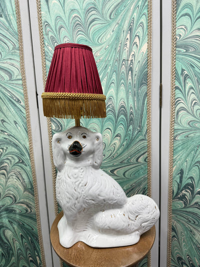 Large classic Victorian dog with a deep red silk shade with fringing. PAT tested. Candle clip bulb included.