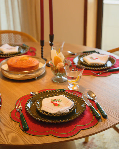 Round placemat with petal-shaped edges and a double contrasting border. Made from a linen and cotton blend, it combines natural texture with a refined finish—ideal for tables that value color and detail.