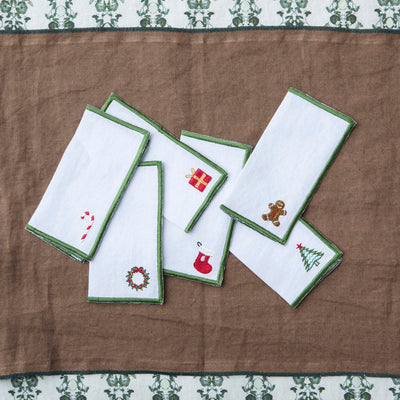 Set of 6 linen napkins with a Christmas theme.