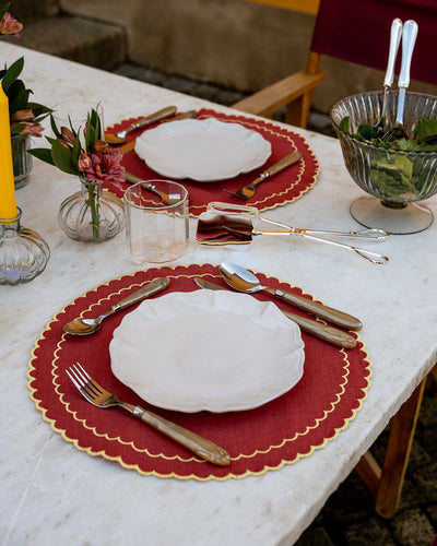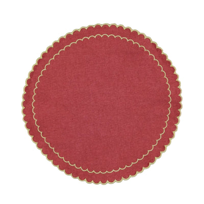 Circular table placemat. Features a scalloped edge finish and an embroidered detail on the interior matching the exterior.