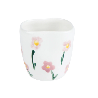 Thus irregular shaped handmade espresso cup is moulded with ♡ and hand-painted in pink prairie print, in Greece. More than just a typical espresso cup, it's a unique piece that will infuse contemporary style into any space.