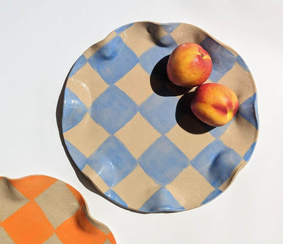 Here is this organically-shaped, irregular stoneware Baby Blue Check Wavy Platter ready to brighten up your dining tables for any occasion. Designed and made in a London studio.