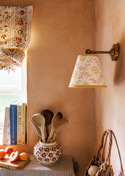 The Folk Flower lampshade is crafted using the wallpaper of the same name. The wallpaper is printed in England using a traditional technique to give the textured feel of a hand-blocked design. Due to the nature of the printing process, there may be slight variations in the pattern. British decorative artist Tess Newall’s collection of wallcoverings and homewares draws inspiration from her hand-painted murals and from her personal collection of antique textiles and prints.
