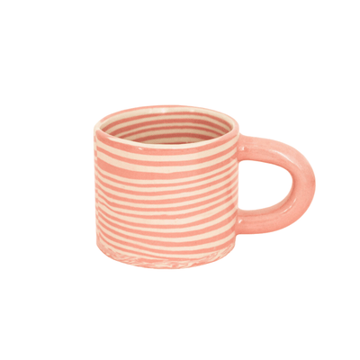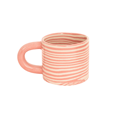 Hand built stoneware mug created by using a slab building method with sliced layers of stained pink and white clay. Each mug benefits from the technique used as it creates a one off piece, with varying stripes and unique patterned base. Each mug is made by Scarlett in PLOP's pottery studio in Bristol. Dishwasher safe although hand washing is recommended as the best method of care.