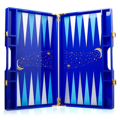 The Luna acrylic Lacquer Backgammon Set is the perfect combination of function and magical design. The set is navy with light blue and silver triangles and a star and moon design. This set will look stunning in the home and makes a perfect gift.