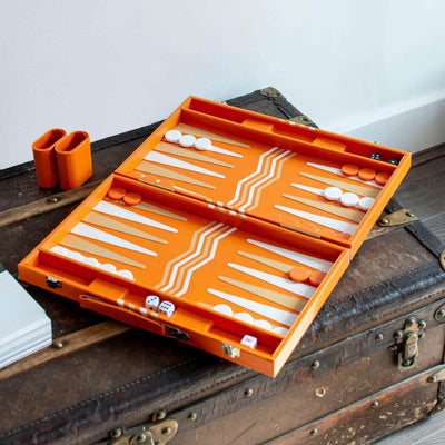 Maison Games' Orange leather Backgammon set is the perfect pop of colour for your home or to bring on your travels.