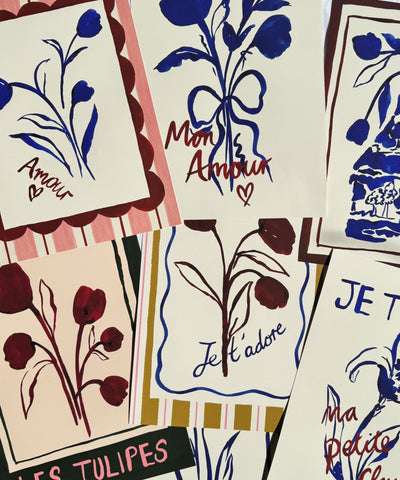 Mixing inky hand drawn flowers with bold stripes and typographic elements, these designs bring a joyful, expressive but gentle charm to any space.