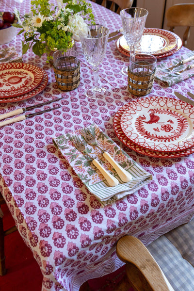 Pure cotton napkins in a new design, Kelpie, made exclusively for The Mews.  This is the pink and green colourway and it comes with a fun green striped border.