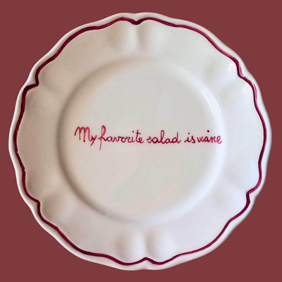 Each set includes: 4 ceramic plates with written on them "My Favorite Salad is Wine"