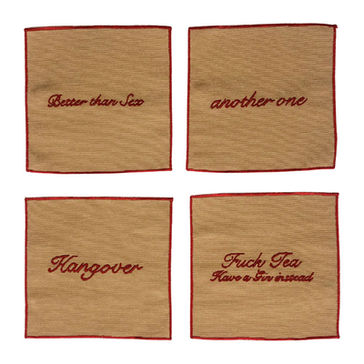 Introducing Musae Studio's fabulous set of 4 cocktail napkins, made from upcycled cotton fabric scraps. These napkins not only help reduce waste but also add a touch of humor to your cocktail hour!