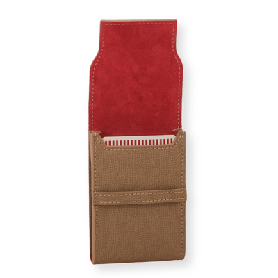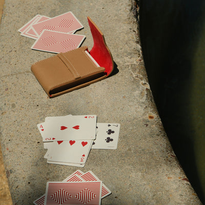 Inside, you’ll find a custom Throwing Doubles playing card deck tucked into a structured Italian leather case in our signature natural tan—finished with bold red suede lining that evokes silk rugs, sun-washed stone, and the glow of lanterns at dusk.