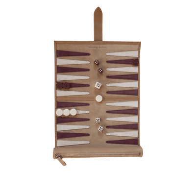 Handmade in Los Angeles, this luxe burgundy travel backgammon set is a perfect addition to any globetrotter’s hand luggage. The set features a leather base with a burgundy, white and tan suede playing field. Ideal for the traveller who can’t resist a game on the go.