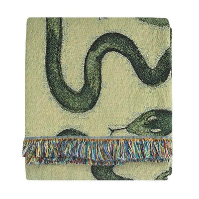 A woven, jacquard throw featuring Rosanns Corfe's fun snake print. This recycled cotton fringed blanket in green is the perfect way to add some unique pattern into your space, use on your sofa, bed or hang on the wall as large statement wall art.