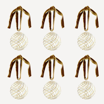 These Christmas tree ornaments feature an eye-catching gold swirl design and are tied with a luxurious velvet ribbon. The six beautiful Baubles arrive in an Issy Granger Christmas box.