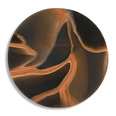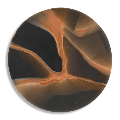 Finely layered burnt orange and pastel peach strands run through and connect segments of translucent grey. We were inspired for this style of marbling by mycelium networks and fungi.