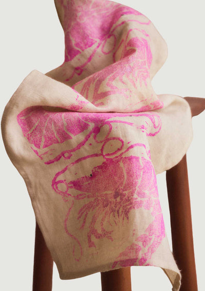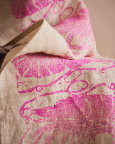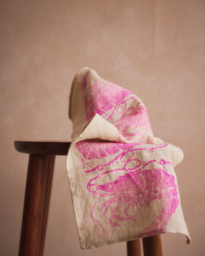This prawn block print design was made by simultaneously printing all the colours, creating a unique design with each print. Using the finest ivory European linen and water based textile ink A testament to luxury and sustainability, mixed media artist Nic Brittin's exquisitely crafted hand block-printed luxury tablecloths and napkins are destined to become a cherished heirloom in your home, designed to be passed down through generations.