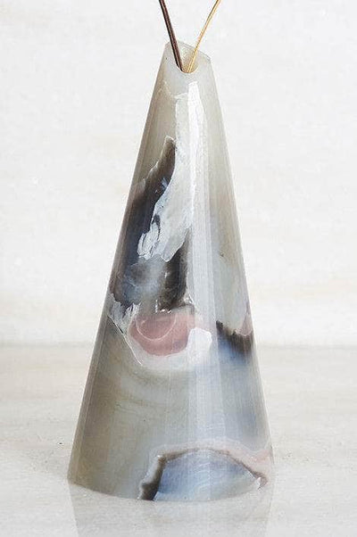On this piece, the snowy base tones are offset by splashes of translucent pale rose and muted black, contrasted with bright veins of white. It is slightly asymmetrical, with a narrow hole in the peak to display dried blooms or flowers.