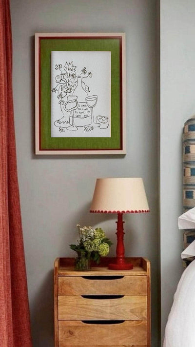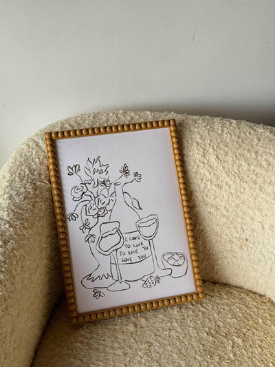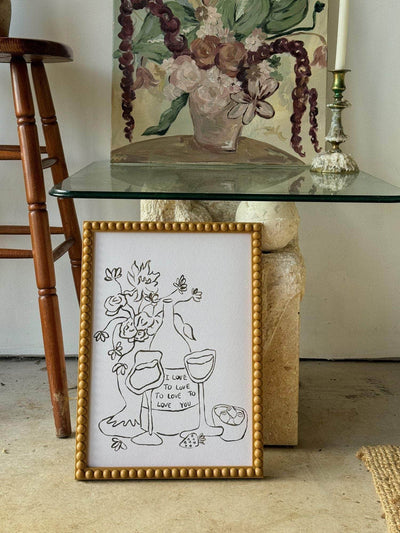 The ‘Love To Love You’ print stands as a testament to the timeless allure of love in all its forms, capturing the intricate connections that we find in both romantic ardor and profound platonic bonds. A print to picture yourself with loved ones drinking wine, eating olives and chatting endlessly on a hot summer’s night together.