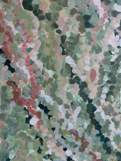 This piece was created after many a walk around the rolling green hills, spotting the flecks of pink in the summer blooms. Harlie hopes that this peace brings as much peace to the viewer as it does to her.