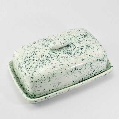 These ceramics are individually hand glazed and fired in Peter Bowen's own electric kiln in Somerset, England, and not mass-produced in a factory. The butter dish is suitable for an 8 oz. or 250g pack of butter or two American Butter Sticks.