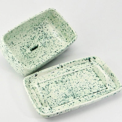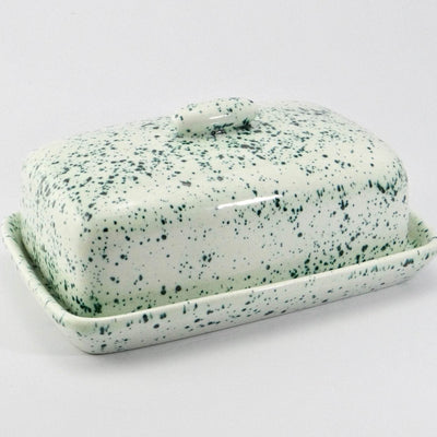 Speckled Green Glaze colour for a uniquely designed ceramic butter dish with lid is an earthenware dish, pottery butter dish with a smooth surface lid in speckled green ceramic glaze with matching glazed dish. This butter dish is an ideal tableware gift for any couple looking for a covered butter dish or butter keeper.