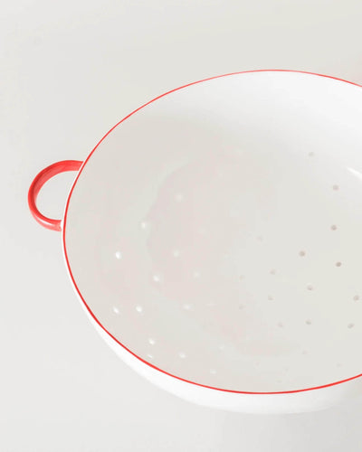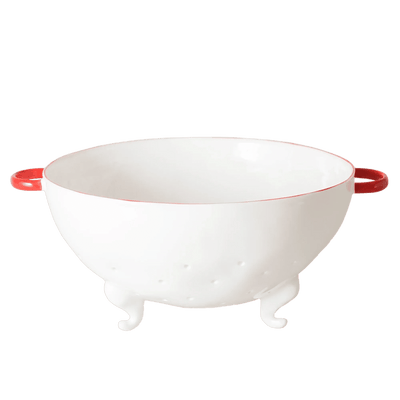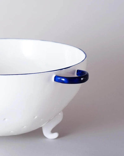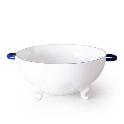 A large Colander sitting tall on handmade feet to elevate it above the work surface and allow for superior drainage. Made from fine bone china, the strongest type of ceramic, this colander was born as so many of our products are: by a need to create something that really works - an object special enough for the table, handmade in fine bone china, but perfectly functional too. The feet lift it high for perfect drainage, the hand punched holes the perfect diameter to let water out and keep spaghetti in.