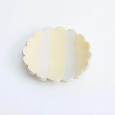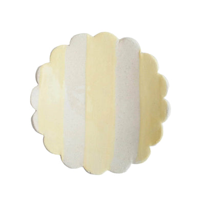 Duci Striped Trinket Dish Yellow, with scalloped edge. Hand built from Staffordshire white stoneware, decorated with coloured slips and glazed with high gloss transparent.