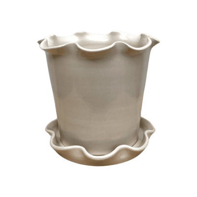 Stoneware pot with a frilly rim thrown on the wheel by hand using an off white clay with a drainage hole punched into the bottom once leather hard. Fired once to 1000 degrees celsius, then stamped, waxed, and dipped individually into a glossy transparent glaze. Once dry the pieces are ready for their final 1260 degree firing.