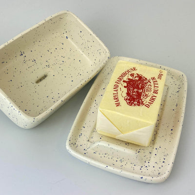 Butter Dish with Light Speckled Blue Glaze finish is a handmade uniquely designed ceramic butter dish with lid in earthenware pottery. This butter dish is the ideal tableware gift or wedding present and very special for the thanksgiving table.