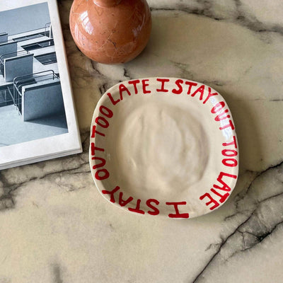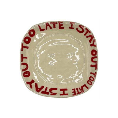 The I Stay Out Too Late Trinket Tray is a signature style for L&Clay Ceramics. A cream square ceramic tray for your keys, jewellery and trinkets, featuring text in red that reads "I Stay Out Too Late". Each piece is handmade and will differ slightly from the image, remaining unique and beautifully wobbly.