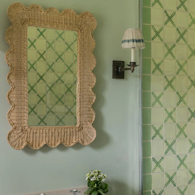 The Mimi Scalloped Mirror (Large) is available in two sizes, medium and large. The scallops are handwoven with sustainable rattan and cane. There are brass hooks at the back for hanging.