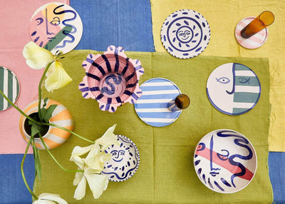 The Sciacca Sun Face Charger. Designed as a charger, a form of place matt that frames your plates and completes your table scapes with style. Bringing a touch of joy to your dining experience. Each one is hand made in Staffordshire stoneware clay. Painted with a free hand design in cobalt blue oxide. Making each one unique and a piece of art that can be hung on your walls, to be enjoyed for a lifetime. Inspired by the village of Sciacca on the coast of Siciliy.