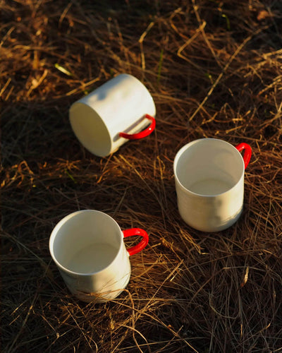 We’ve made some bespoke boxes to house sets of four of our original mugs. Mugs are the first things we ever made for Feldspar and they continue to be among our most sought after objects. These tea mugs hold 12oz, or an excellently generously sized cup of tea. Each is cast finely using bright white fine bone china, with dimpled, uneven profiles that make them a joy to hold - hands aren’t perfectly cylindrical and neither are our mugs. With a hand painted handle, they come in three colours - our classic Cobalt Blue, bright Geranium Red, Forest Green or, if you’re feeling really fancy, 24ct Gold.