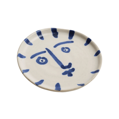 The Blue and White Picasso-esque Sun Face butter Plate is crafted from white Staffordshire stoneware with a beautiful hand painted cobalt blue line. Finished with a natural edge to show the makers hand and show case the beauty of the clay. Inspired by heritage Sicilian pottery Sellers designed her ceramic table ware with functionality in mind.