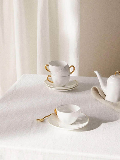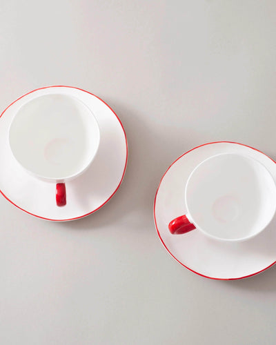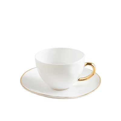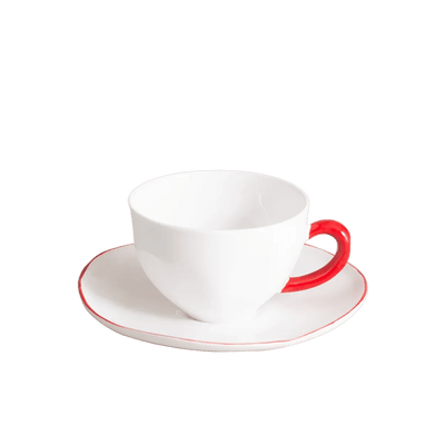 Our rounded, dimpled cup sits perfectly in the hand, for when you still need to cradle a warm drink and has a wide saucer to sit upon, beside those biscuits. With a small curved hand-painted handle, and a large saucer with an uneven profile and our characteristic hand-painted banding to emphasise its sketch-like nature. A treat for treats, or just for your everyday. Available in either Cobalt, Geranium Red or 24ct Gold.