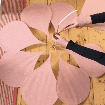 The iconic petal light in its precious form. The unexpected combination of brass and fabric in a floral and airy suspension. With the simplicity of a drop-shaped petal. This pendant light plays subtly with light, diffusing a soft light in the room and delicate play of shadows on the ceiling. Its 8 adjustable petals allow you to compose your own play of lights and turn it into a unique luminaire.