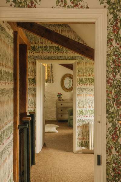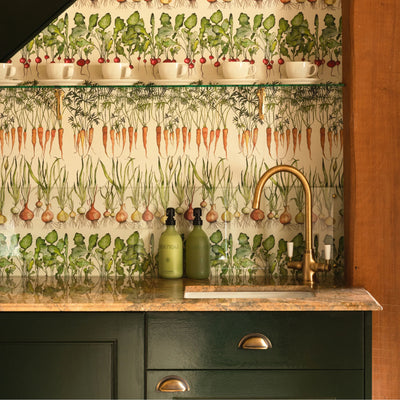 Inspired by the linear rows of carrots, radishes and onions in the kitchen gardens at Thyme, Bertioli's Founder, Caryn, had a vision to create this incredible unique design by hand painting the vegetables in a beautiful way. The printing translates the delicate watercolours and its almost as if the design has been painted directly onto walls. Designed to compliment a plain colour interior or for the full stunning impact, as the Gardener's Cottage at Thyme, compliment with the Kitchen Garden range of interior fabrics. This design goes particulary well with all prints in this range especially Carrot and Radish.