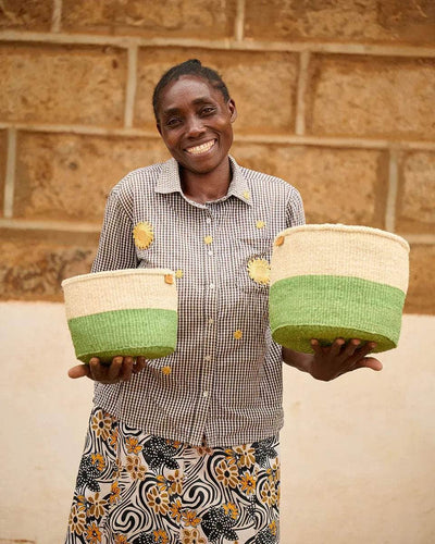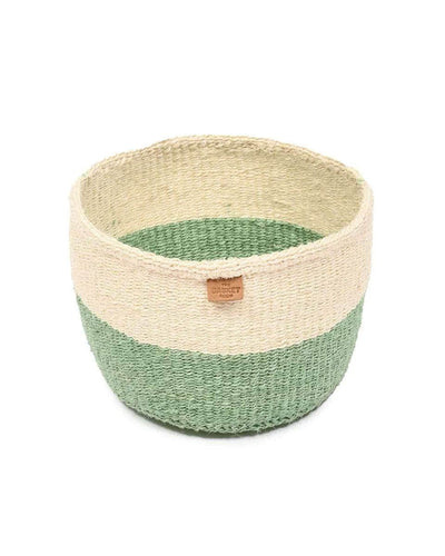 These soothing sapling green and white colour block baskets are ethically produced in three handy sizes, woven from sustainably sourced sisal grass by artisan women in rural Kenya. Use your new woven storage basket for keeping jewellery, toiletries and stationery organized, or fill yours with fruit, dried flowers, children’s toys, remote controls, rugs, gloves and hats. These round sisal baskets make excellent desk tidies, toy baskets and woven planters for your houseplants – and inspired new home gifts. Whichever way you choose to use your new colour block basket it is sure to bring a dash of texture and pastel-hued joy to your home.